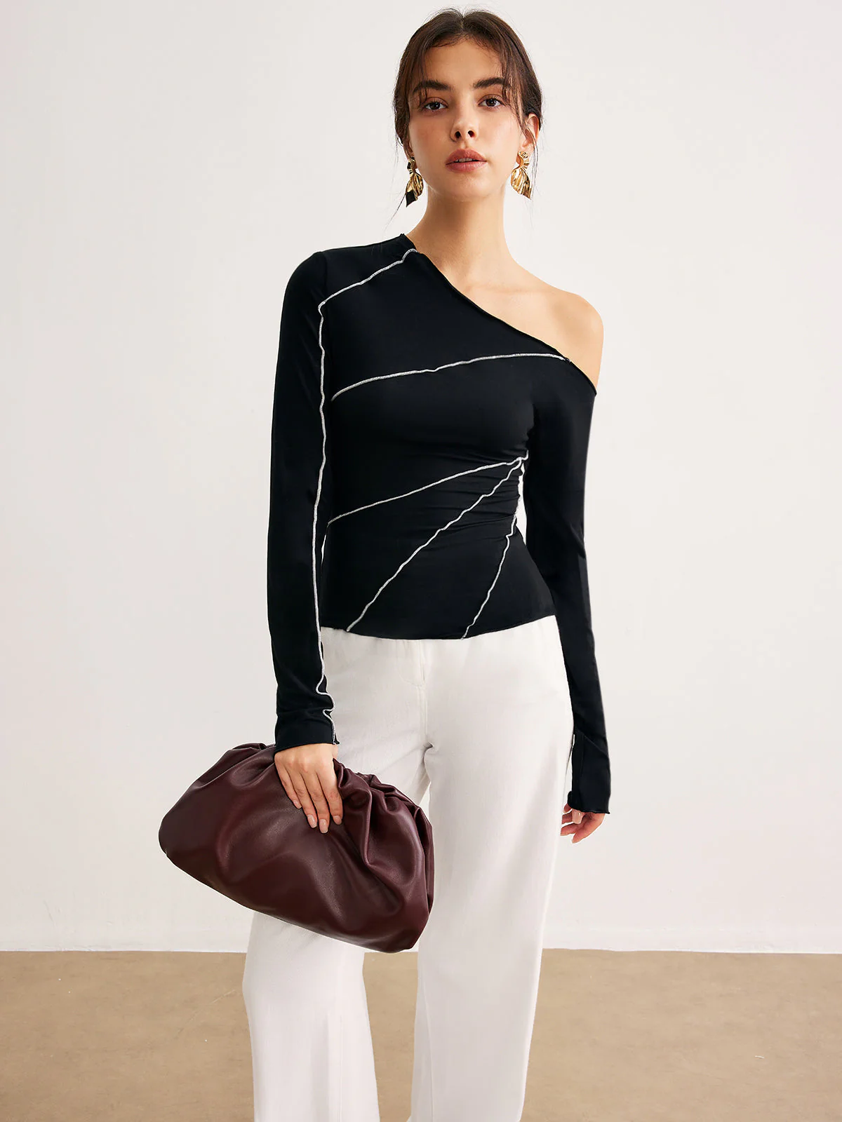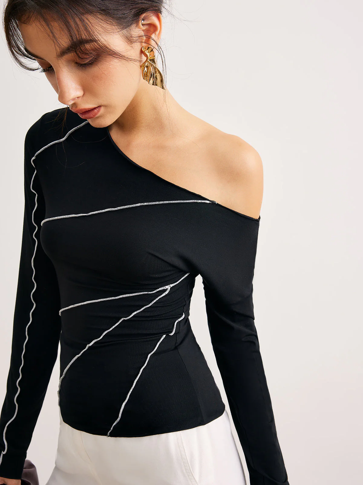 This asymmetrical black one-sleeve top subtly reveals the shoulder while shaping the silhouette with its white contrast stitching.