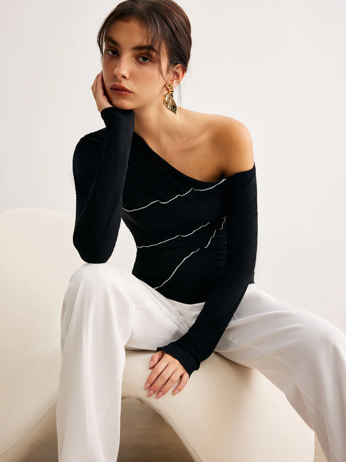 Asymmetrical Black Top | One Long Sleeve | Contrast Seams