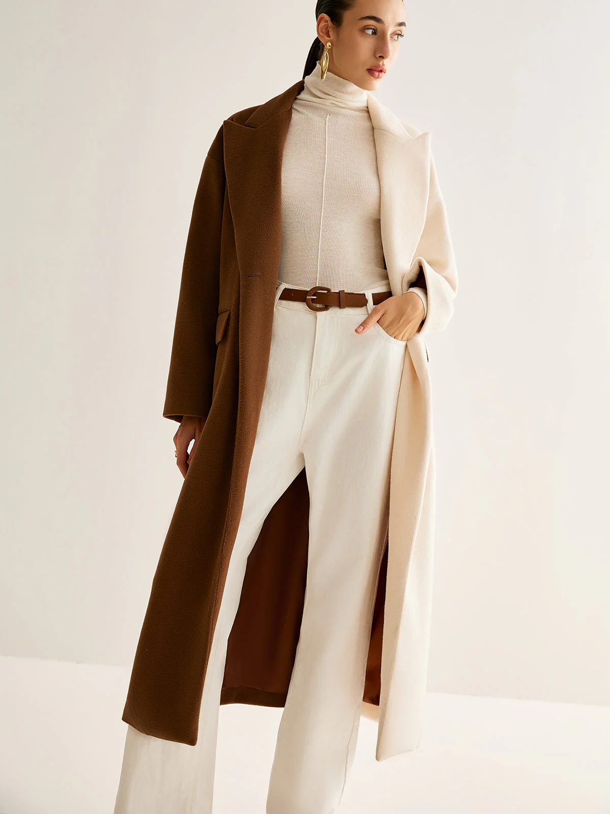 This two-tone long wool coat offers an elegant silhouette with a modern artistic touch.