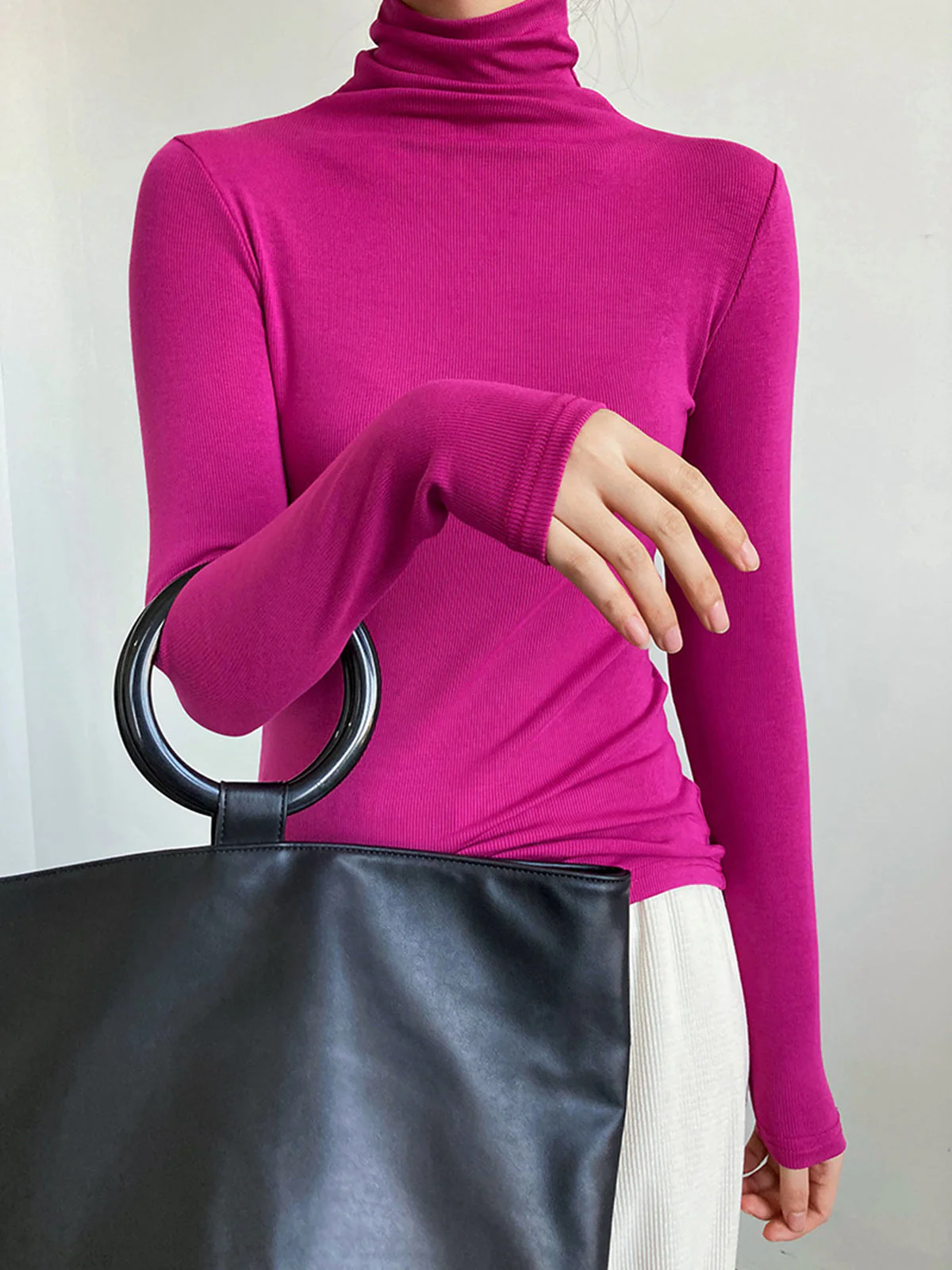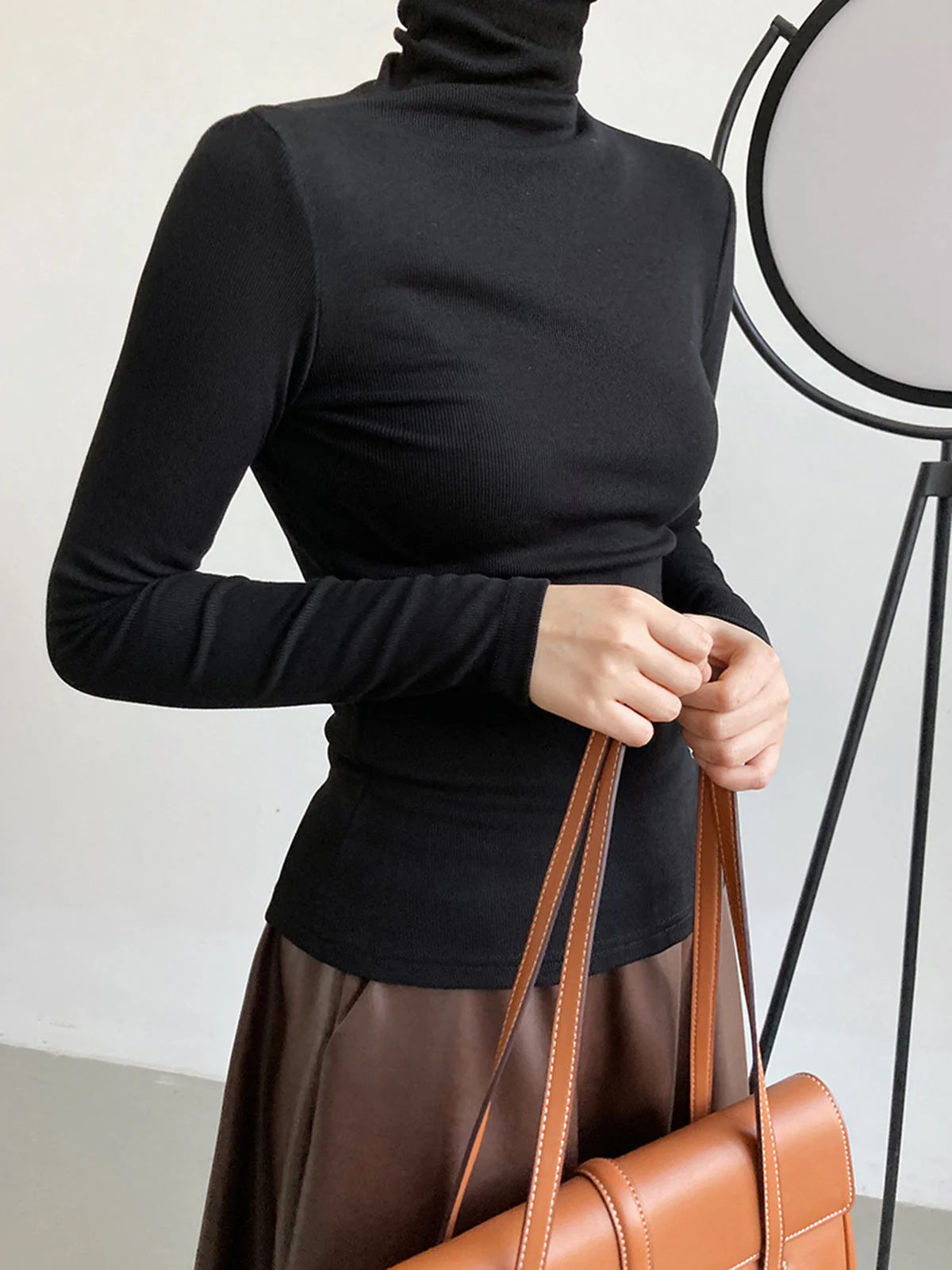 This long-sleeved black turtleneck is a wardrobe essential, perfect for cool days or streamlined looks.