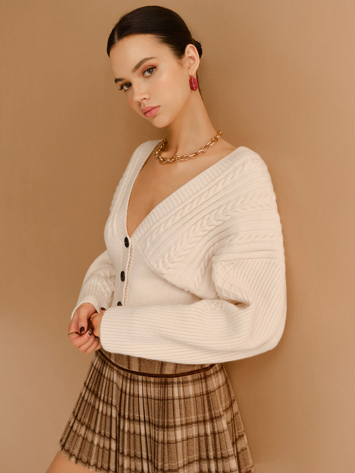 Ce cardigan crème à manches chauve-souris et gros boutons noirs allie volume et structure pour un look féminin et affirmé.