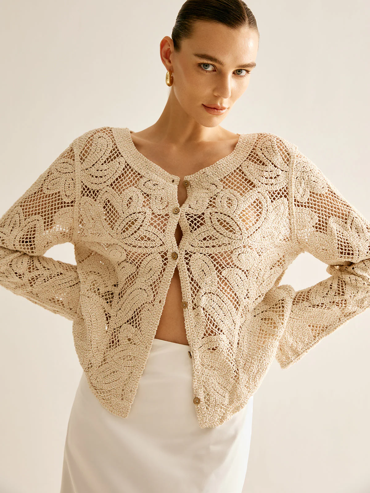 Ce cardigan en crochet ajouré se distingue par son motif floral délicat et son allure artisanale.
