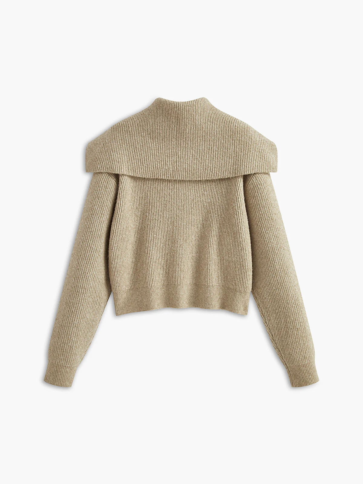 Ce cardigan zippé en maille beige allie confort et modernité avec sa capuche à effet drapé et sa coupe légèrement raccourcie.