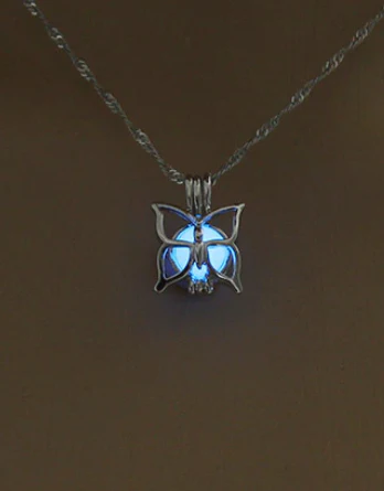 Le Collier Papillon Lumineux sera phosphorescent dans la nuit. Il lui suffit de prendre la lumière du soleil durant quelques minutes pour resplendir durant des heures.