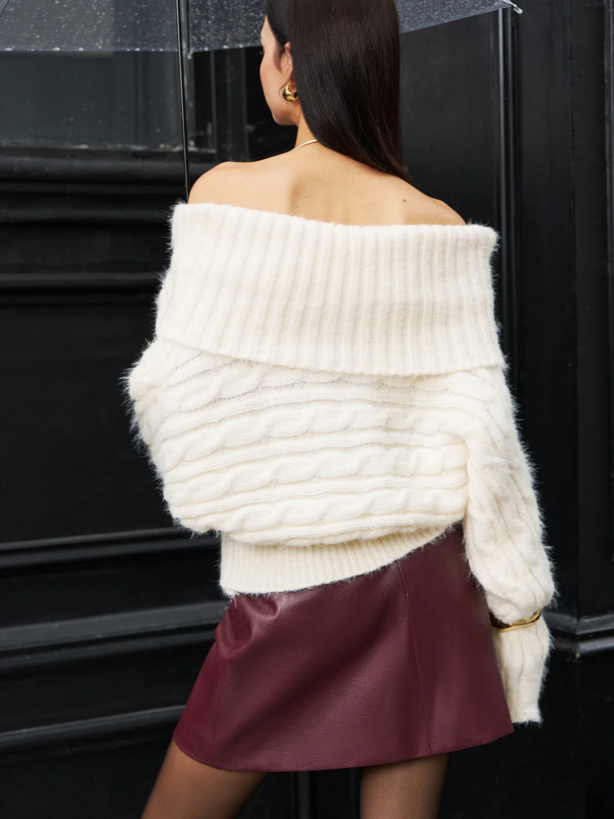 This cream sweater with bare shoulders and textured knit adds a touch of femininity and elegance, while remaining cosy.