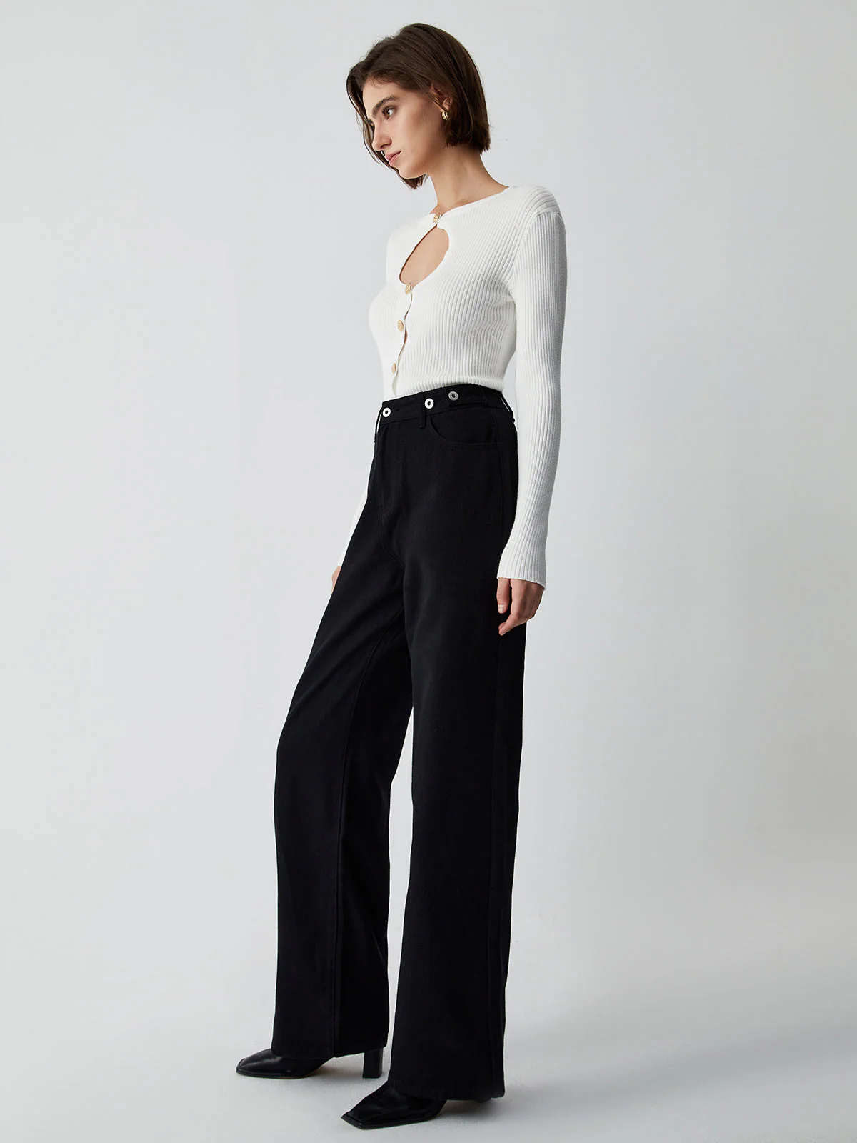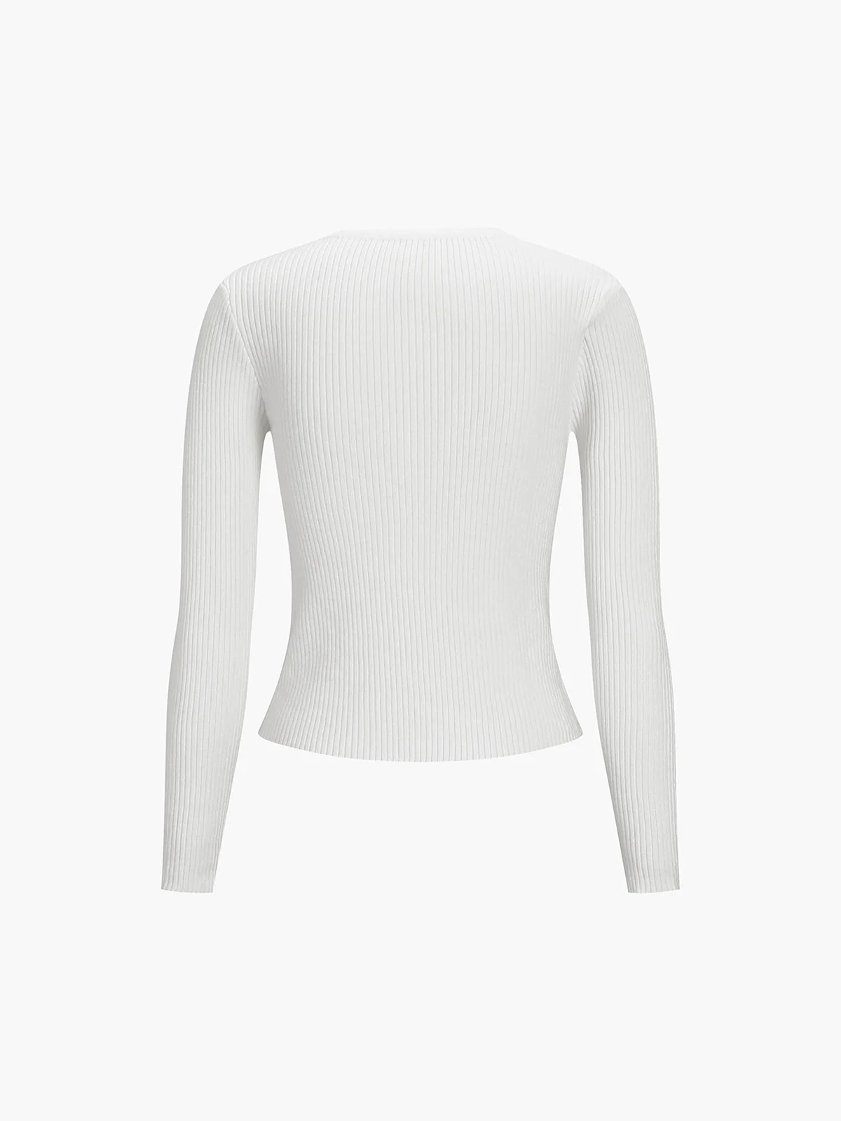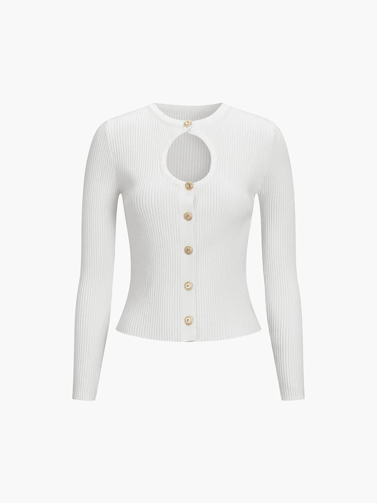 This white rib-knit cardigan stands out with its teardrop-shaped front opening and refined gold buttons.