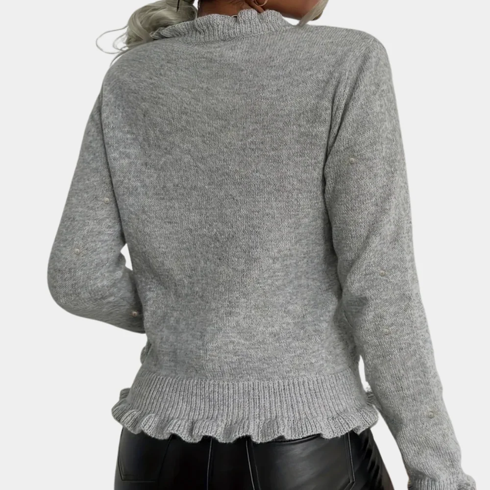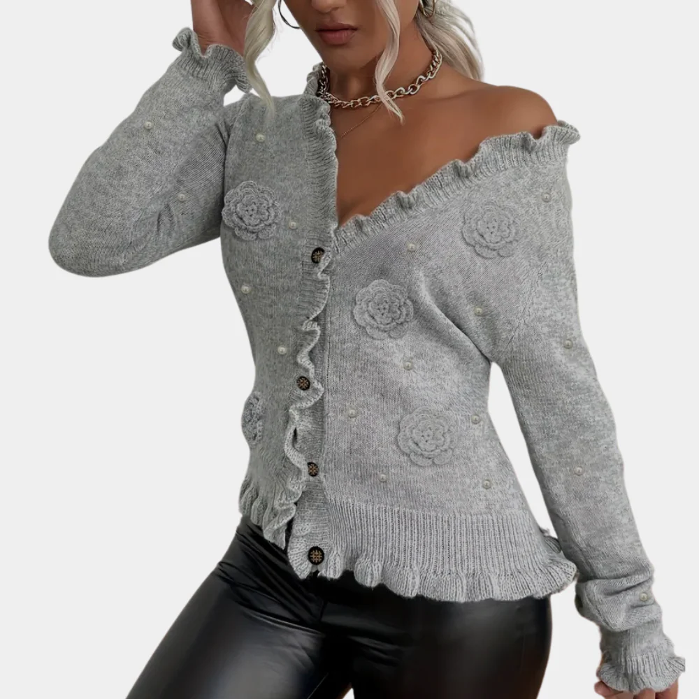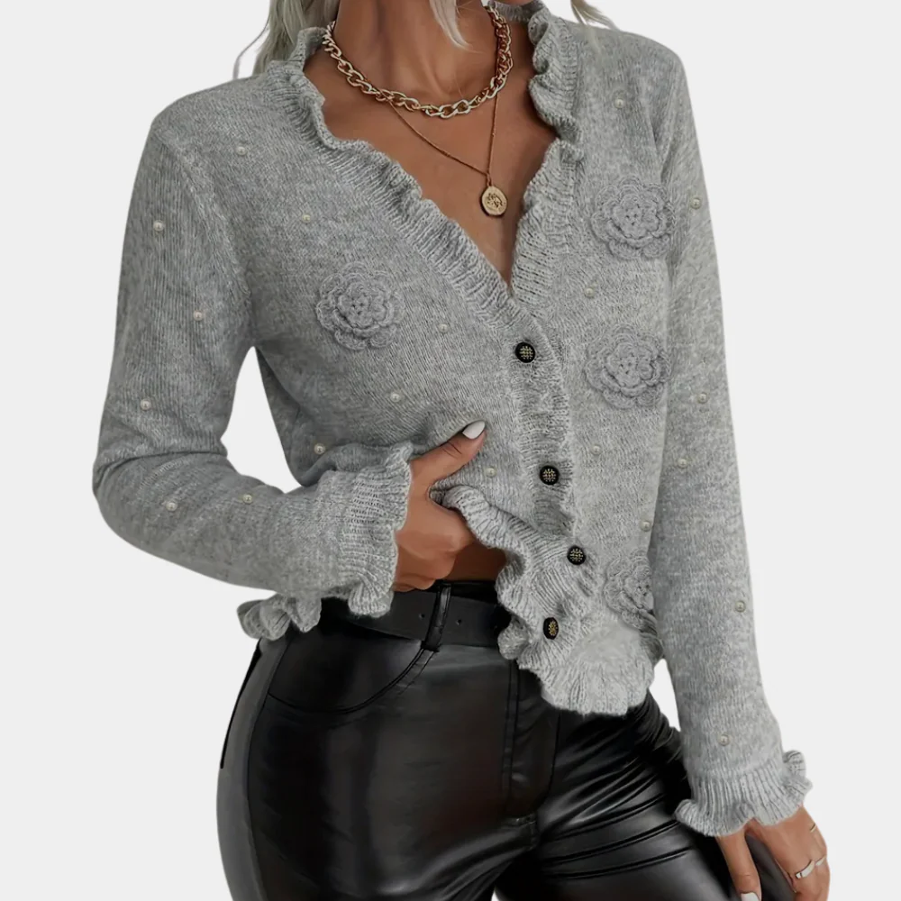 This pearl-gray knitted cardigan adorned with embossed flowers and delicate pearls adds a soft, elegant touch to your style.