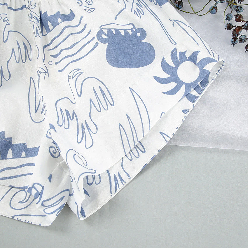 La chemise ample assortie au short crée un look décontracté, tandis que l’imprimé bleu unique apporte une touche artistique et moderne.