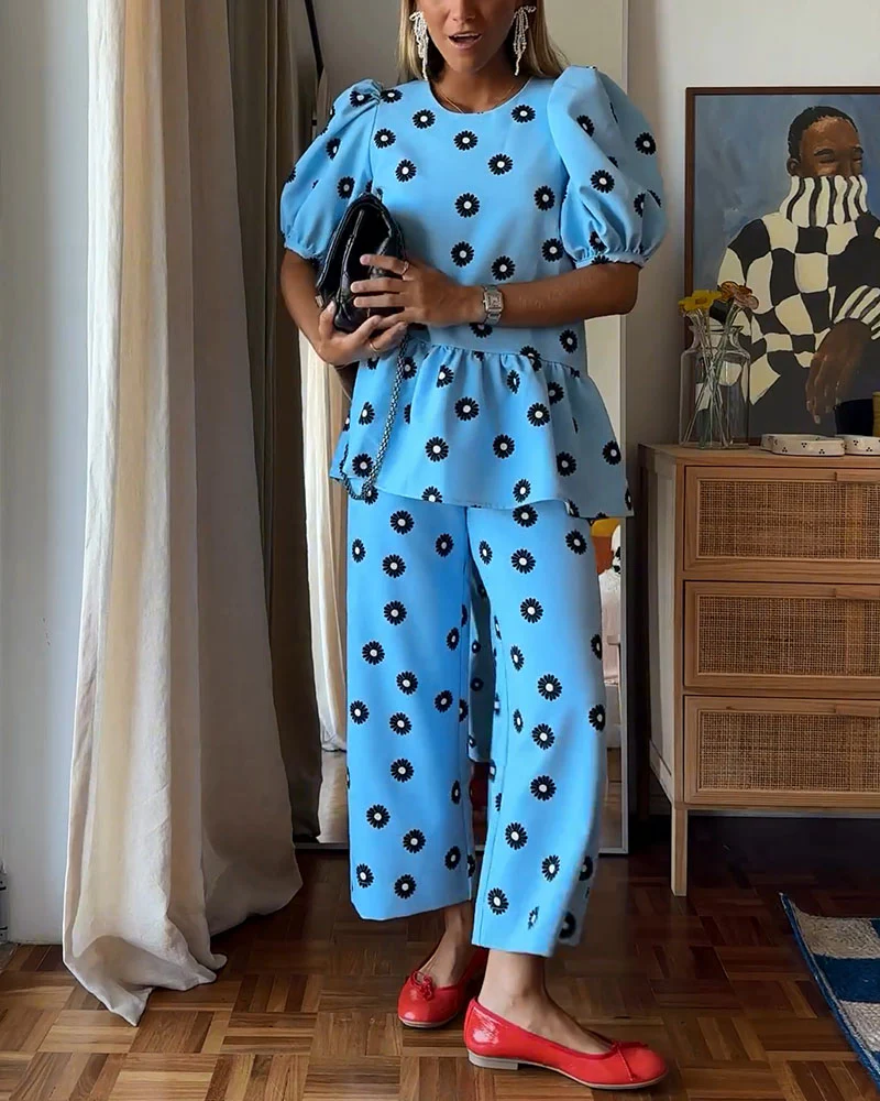 Cet ensemble bleu ciel à imprimé fleuri, composé d’un haut à manches bouffantes et d’un pantalon fluide, combine esprit rétro et élégance moderne.