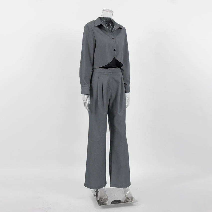 The cropped shirt and wide-leg pants form a minimalist duo, perfect for a confident, controlled look.