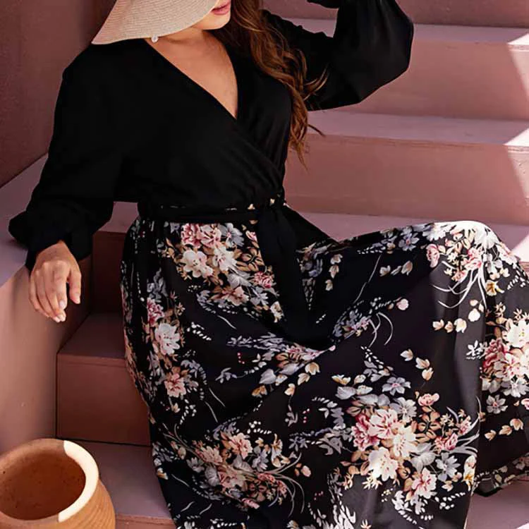 This sunny floral wrap dress flatters the figure with its tied waist and flared skirt.