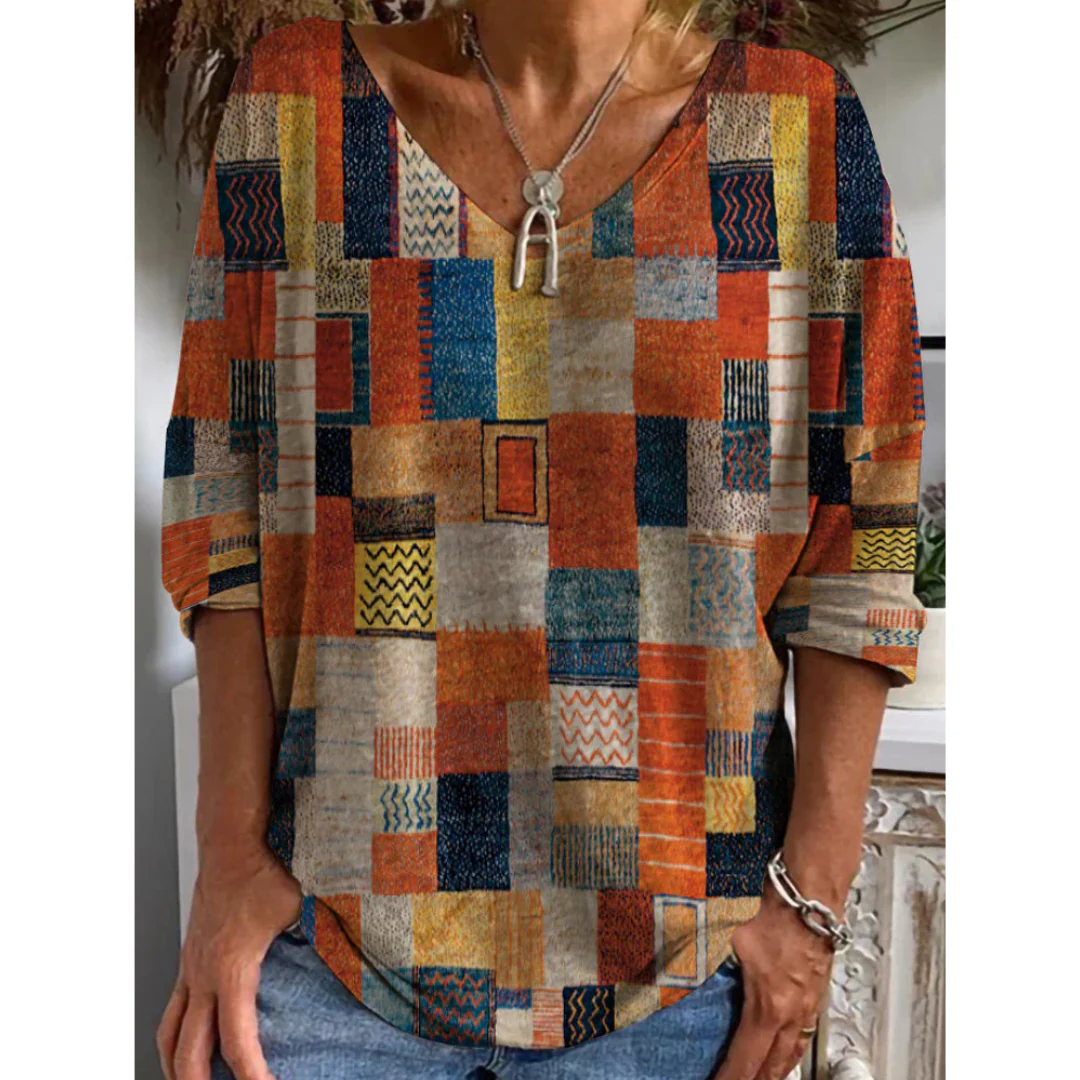 Avec ses motifs géométriques et ses tons chauds, ce haut apporte une touche artistique et vintage à votre look.