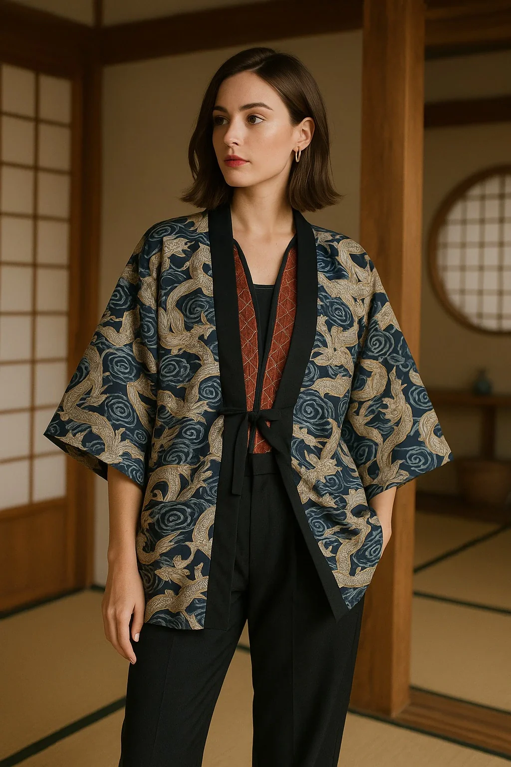 Ce manteau kimono incarne l’esprit japonais avec son dragon magnifiquement brodé. À la fois traditionnel et moderne, il offre une silhouette fluide, confortable et résolument unique. Parfait pour les passionnés de culture nippone et de mode affirmée, il s’impose comme une pièce forte de votre garde-robe.