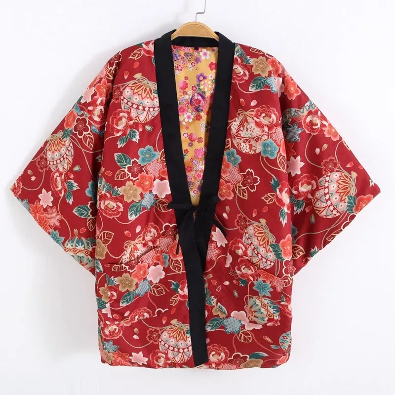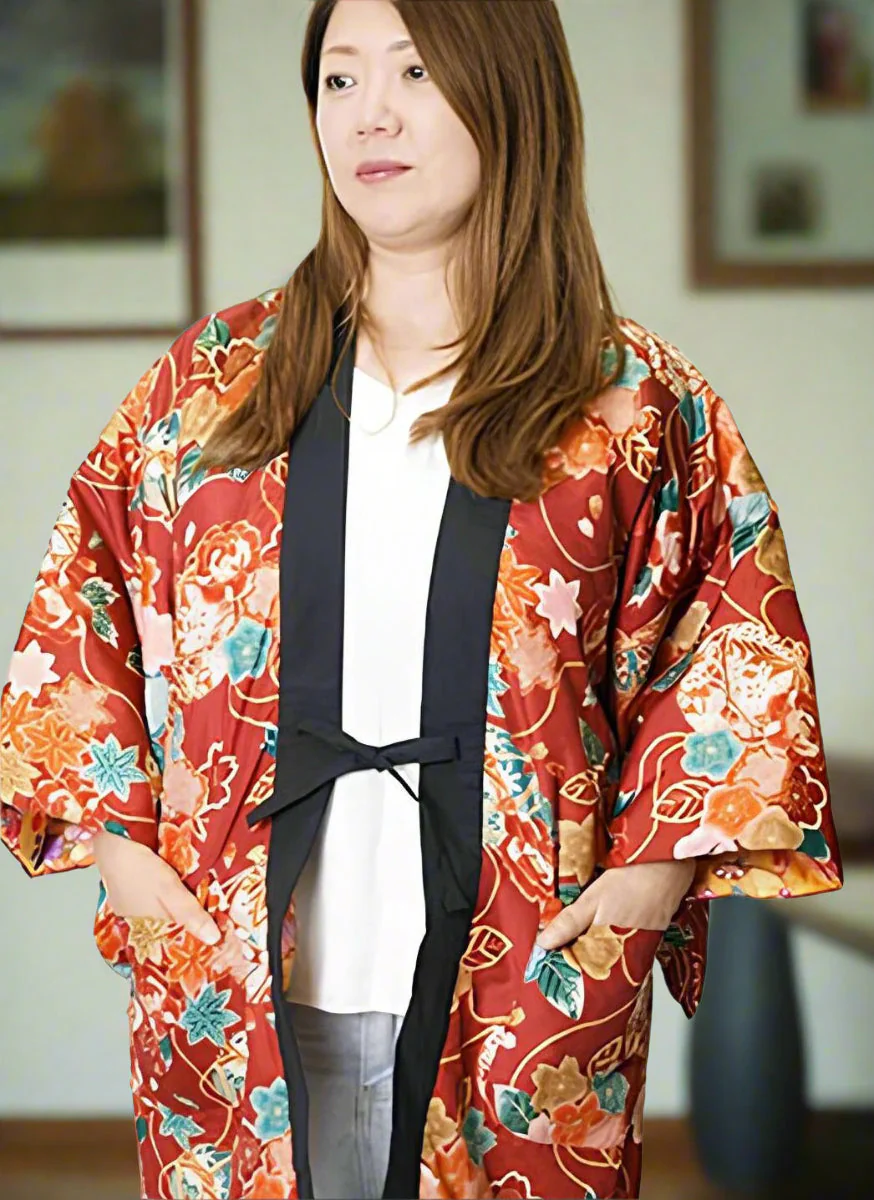 Ce manteau kimono rouge fleuri conjugue style et praticité. Son tissu en coton léger, idéal pour les mi-saisons, est doublé pour vous offrir une douce chaleur. Réversible, il vous permet de varier les styles tout en conservant une allure élégante et décontractée, inspirée du Japon traditionnel.
