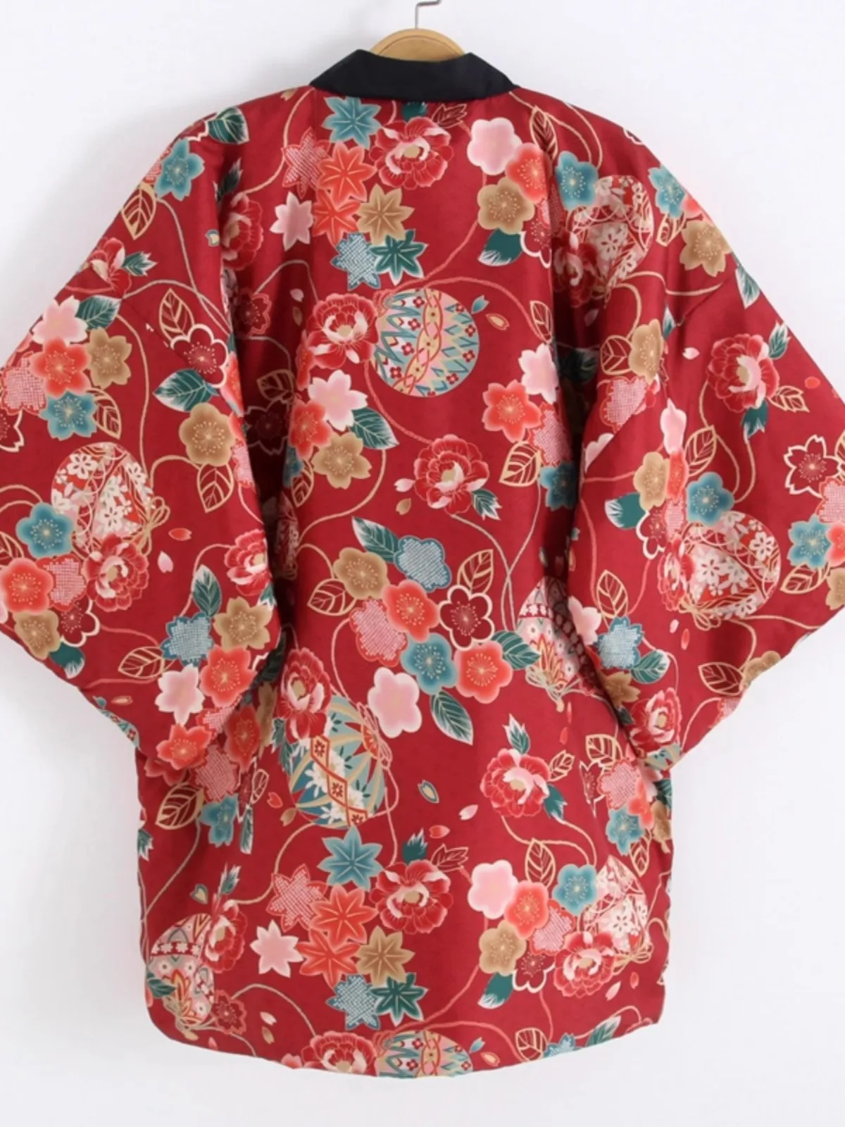 - Kimono court à imprimé floral rouge, Ample et confortable, manches larges