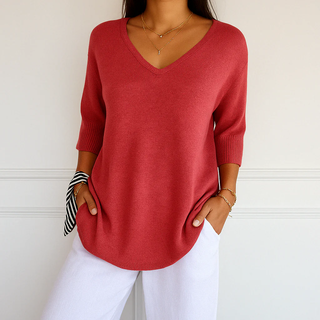 Ce pull col V en maille fine offre une coupe fluide, idéale pour une silhouette féminine sans effort.