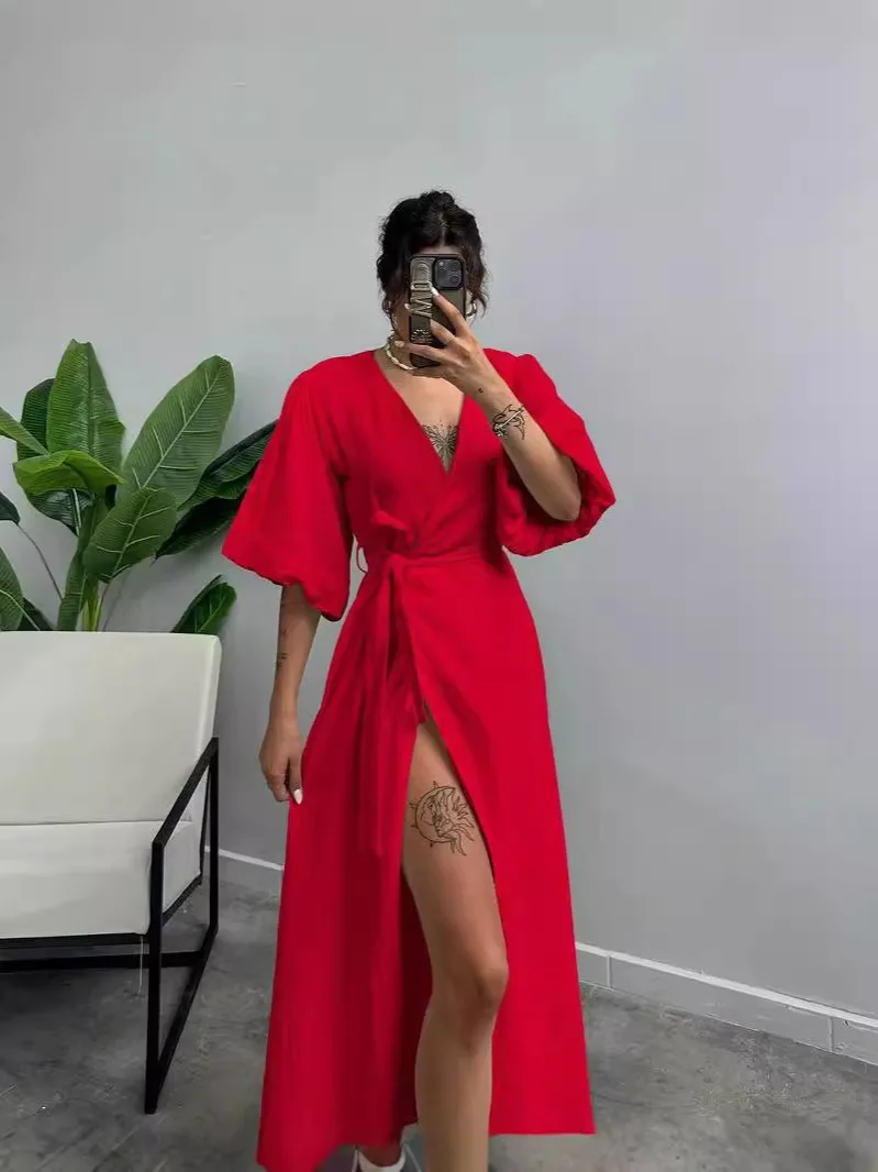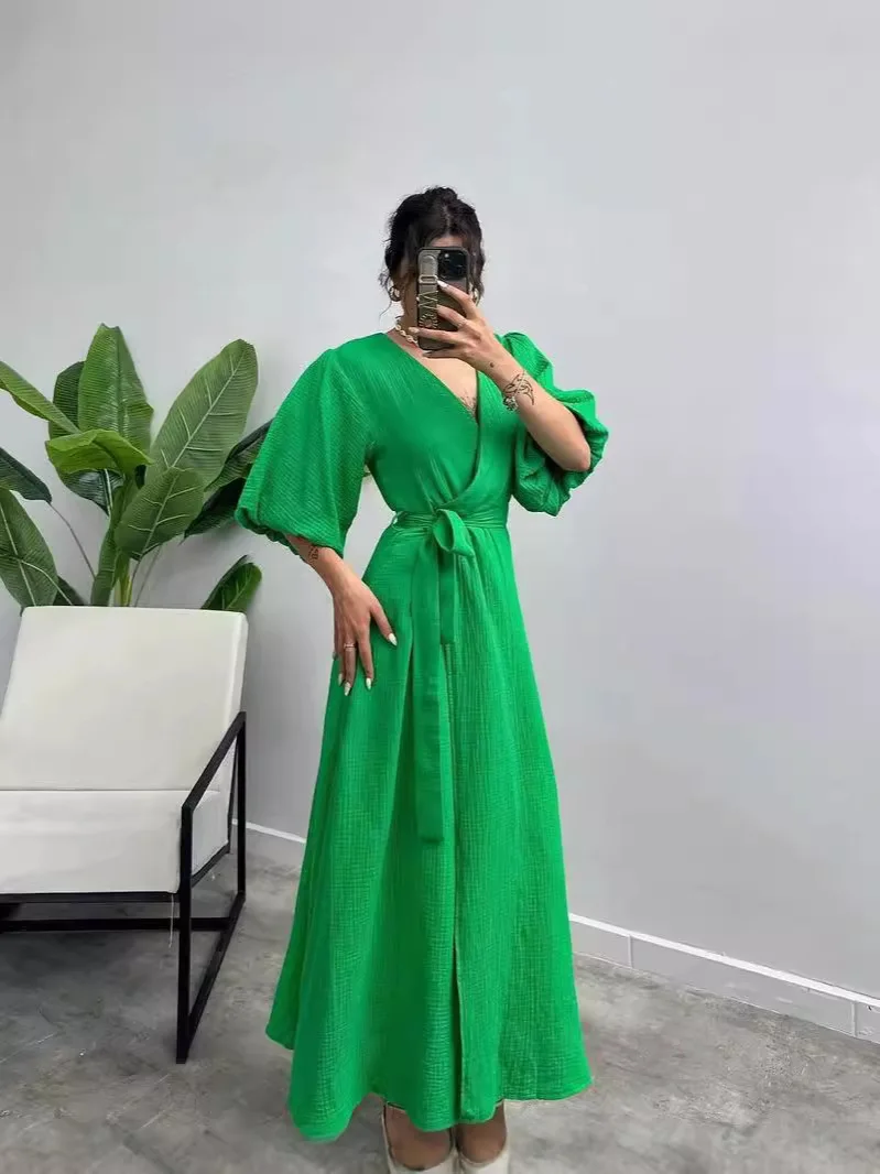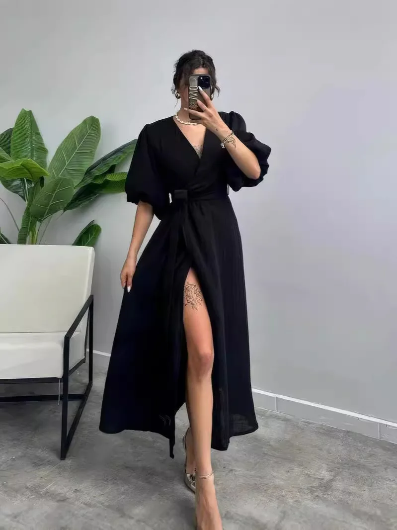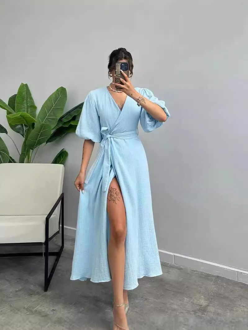 Cette robe kimono chic allie avec finesse un design épuré et une coupe asymétrique tendance, idéale pour celles qui recherchent une tenue à la fois raffinée et confortable. Sa silhouette fluide et son col en V féminin en font un vêtement parfait pour les événements estivaux ou les dîners élégants.