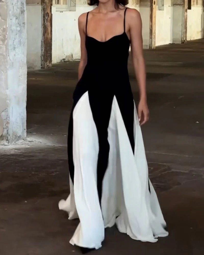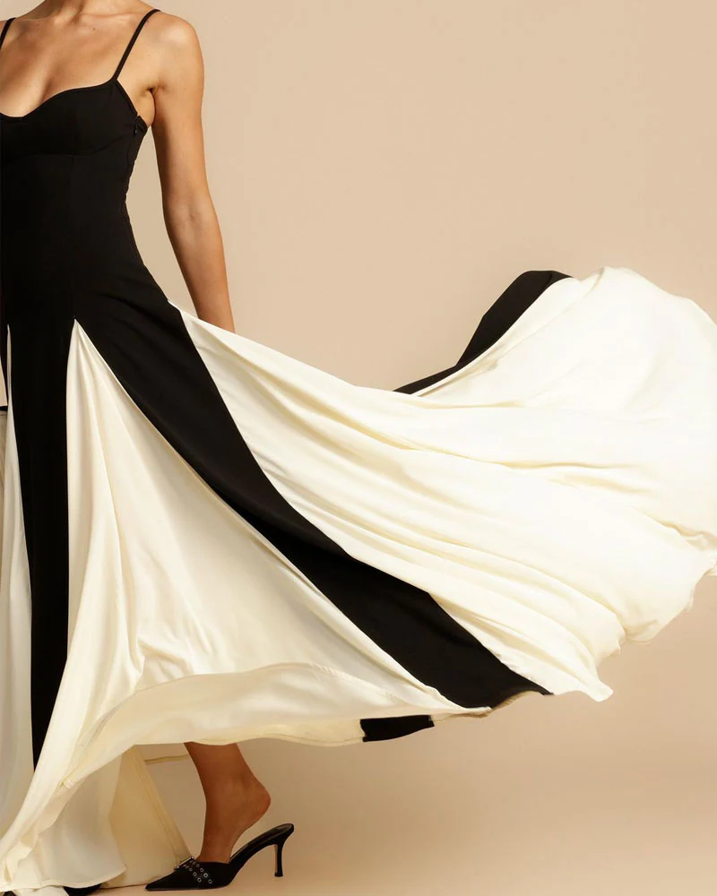 • Design : Robe longue avec fines bretelles, haut noir ajusté et bas évasé bicolore