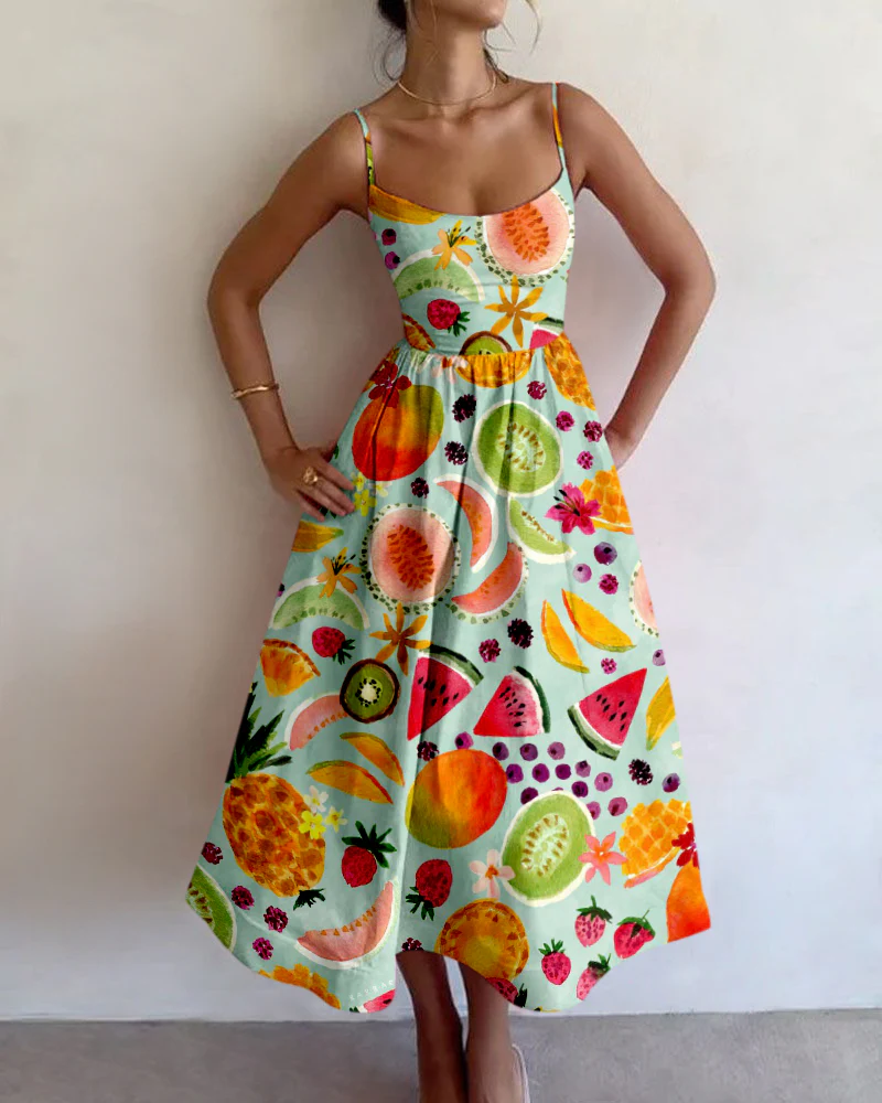 Cette robe midi aux imprimés fruités éclatants est un concentré de bonne humeur.