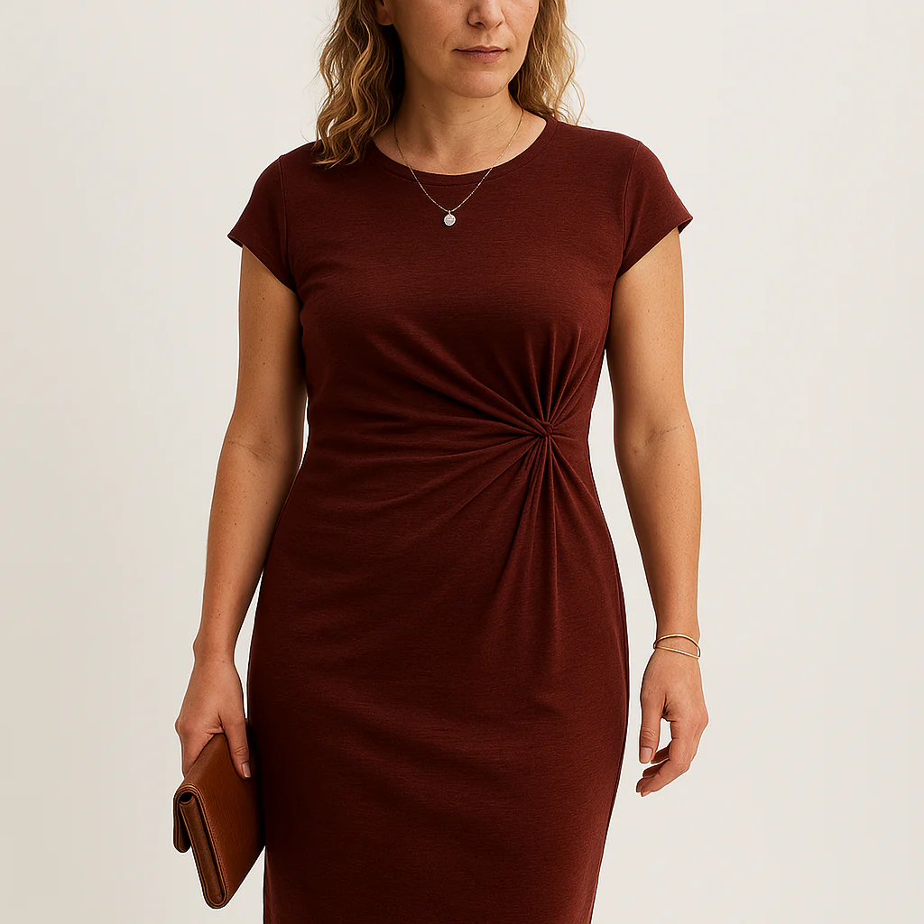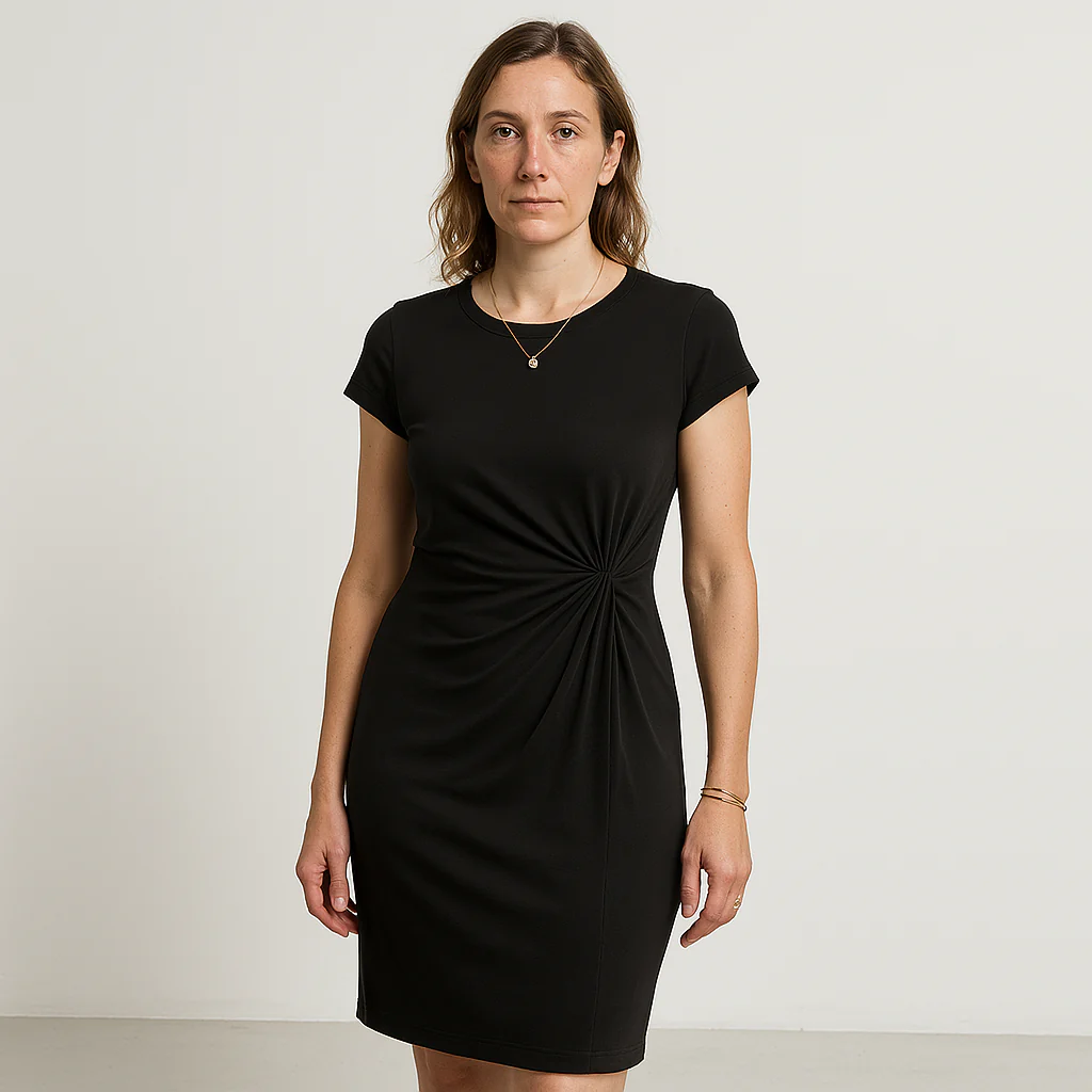 Sa coupe ajustée et son détail twisté à la taille subliment la silhouette avec discrétion.