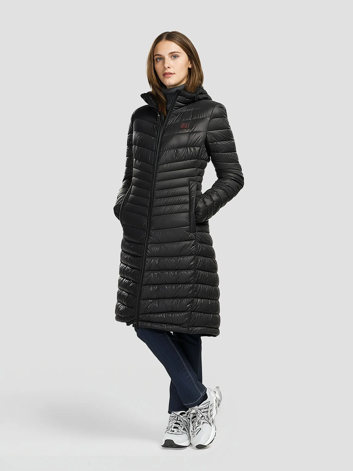 Notre longue doudoune pour femme est un incontournable pour passer l’hiver ou faire de la randonnée. Elle est équipée de trois films chauffants répartis au niveau du cou, de l’abdomen et du dos.