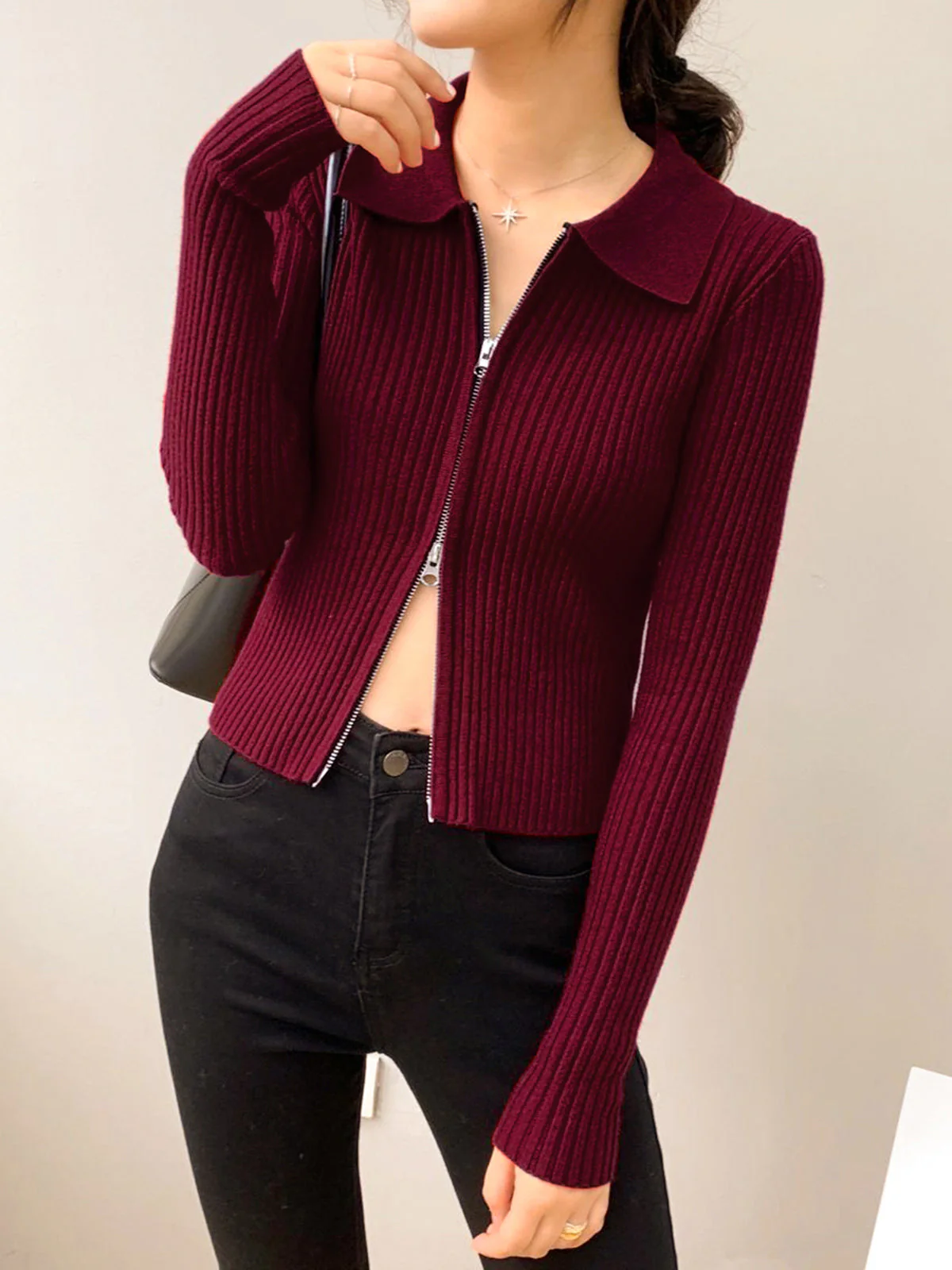 Ce top zippé en maille côtelée bordeaux combine coupe près du corps et col polo classique pour une allure moderne et féminine.