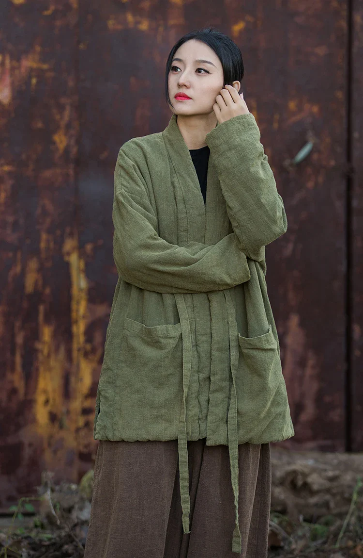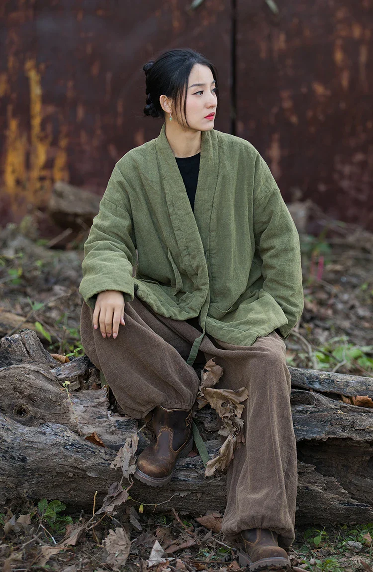 Conçue en coton et lin, cette veste kimono ample vous enveloppe dans un confort chaleureux tout en restant respirante. Parfaite pour l’hiver, elle combine douceur, naturel et allure vintage. Sa coupe généreuse s’adapte à toutes les morphologies pour un look cosy et raffiné au quotidien.